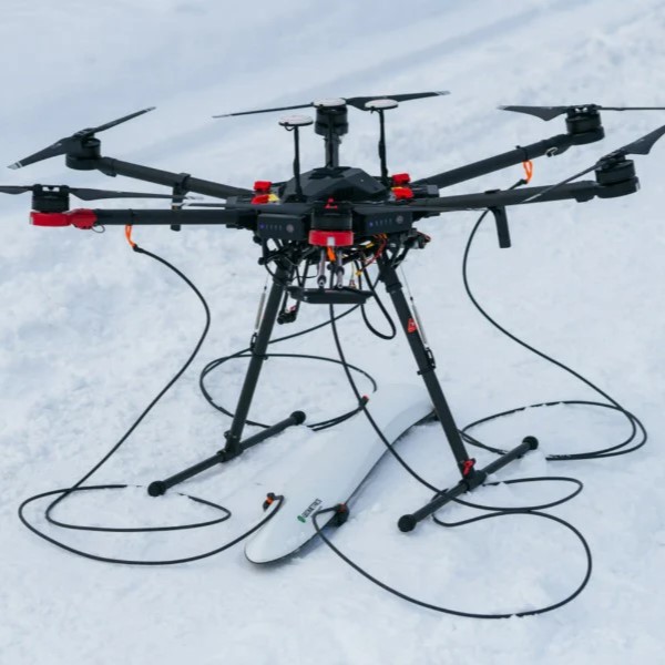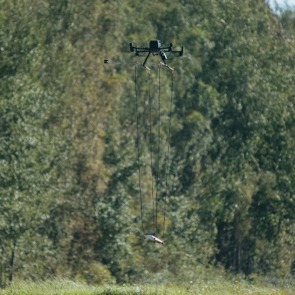 Per ridurre al minimo i rumori provenienti dai motori e dall’elettronica del drone, si consiglia di utilizzare corde di sospensione lunghe 3 m per montare MagArrow sotto il drone. Per tale configurazione si consiglia di utilizzare droni più grandi come DJI M600 Pro o simili, con droni più piccoli (DJI M350 /M300 RTK, ecc.) si consiglia di utilizzare pali di estensione per le gambe del drone.