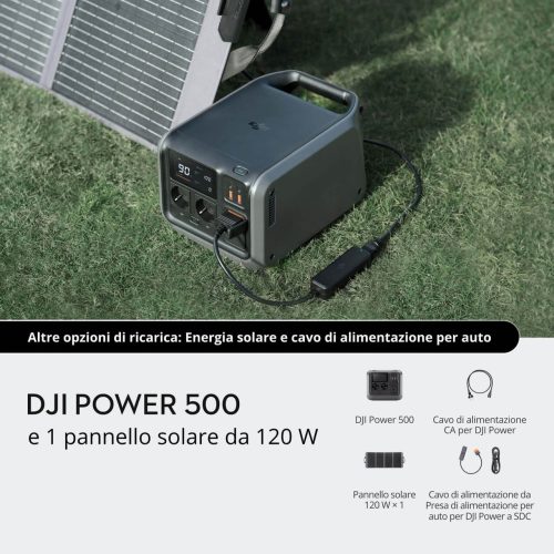 DJI Power 500 può essere collegato ai pannelli solari tramite il modulo MPPT o il cavo di alimentazione per auto SDC [8] per la ricarica solare.